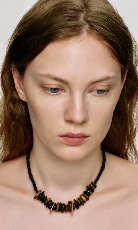 This necklace combines natural pietersite stones with braided leather cords for a textured, layered look. The gemstones are polished for depth and color variation, creating an earthy yet luxurious accessory.