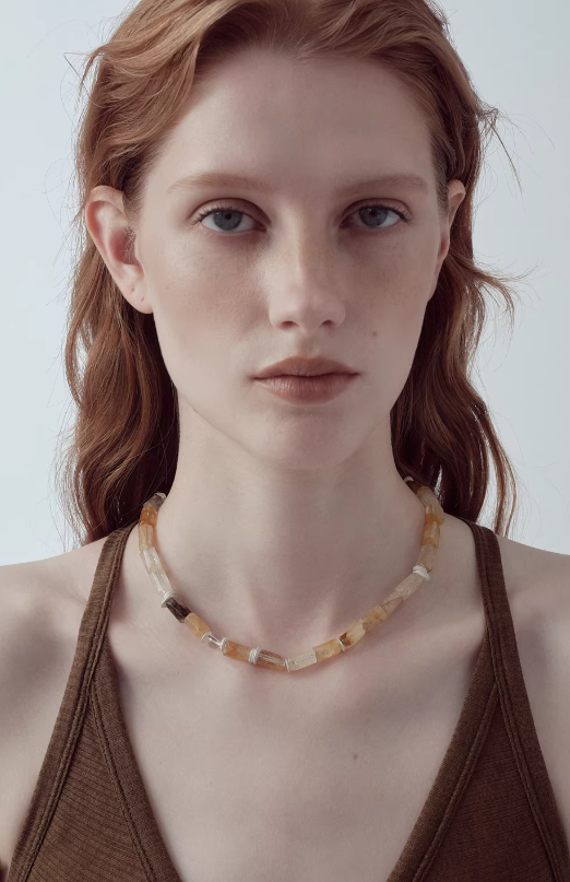 This necklace combines natural crystals with sterling silver beads, arranged in a mosaic-like pattern. Each bead is carefully polished and hand-strung to ensure symmetry and movement.